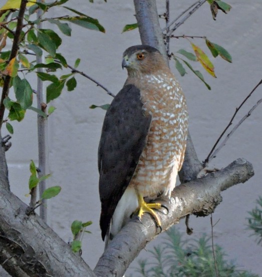 Near this plum tree are bird feeders hanging from an olive tree.