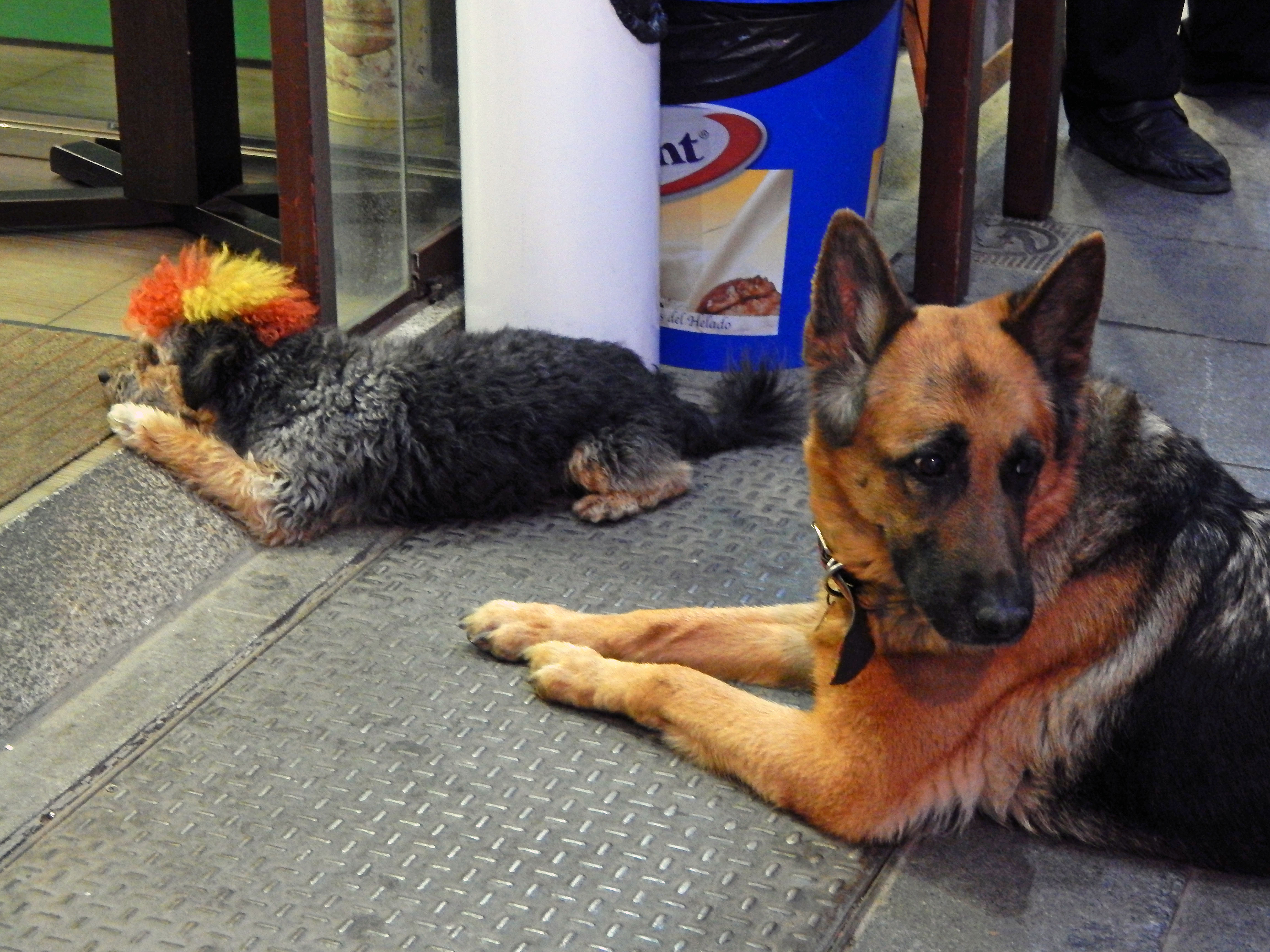 You have to love how the German Shepherd looks embarrassed to be seen with little mohawk. Great shot.