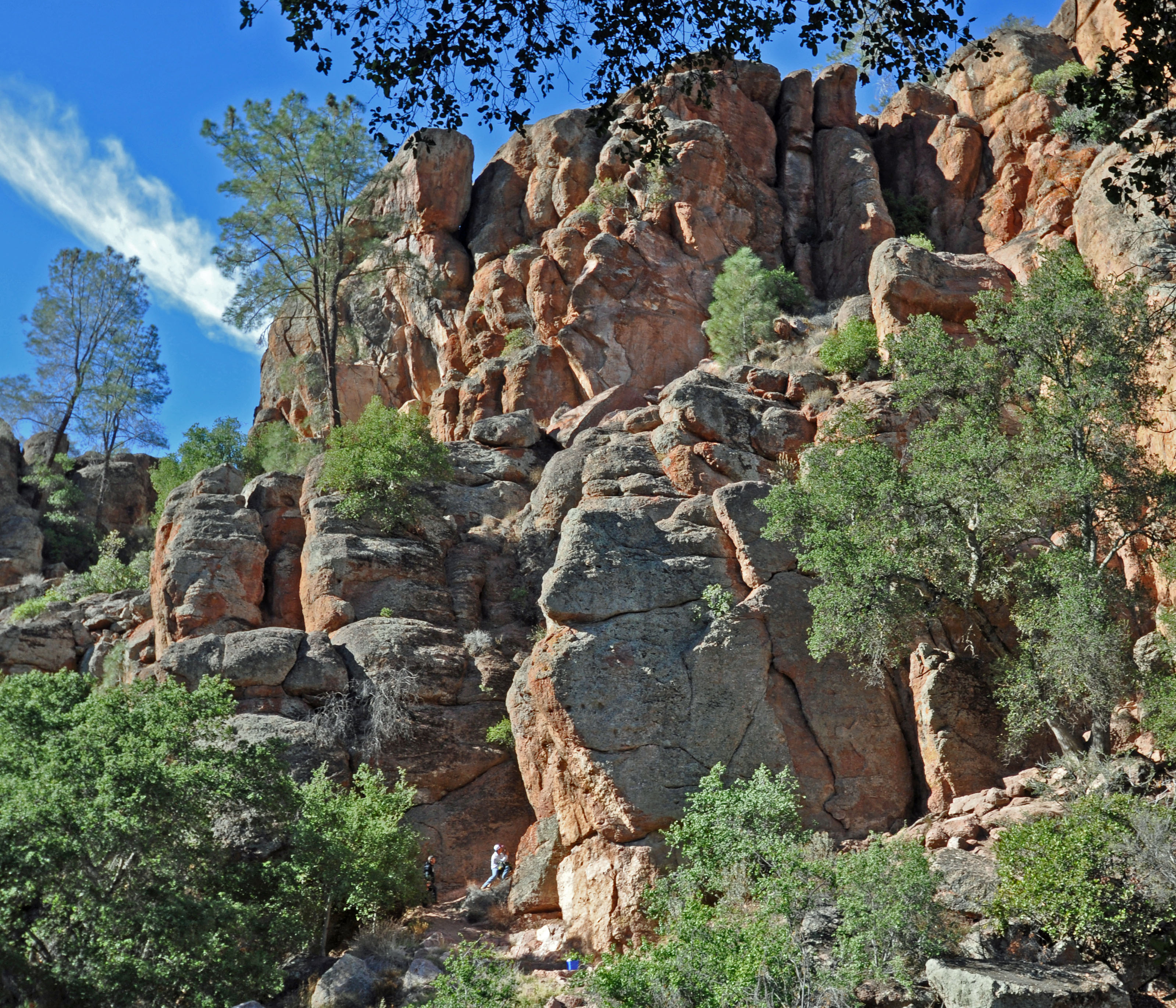 Millions of years of tectonic motion both brought the volcanic rocks here and lifted and tilted them, exposing them to erosion by wind and rain that has carved the spires and canyons of Pinnacles National Park.  As the steep canyon walls erode further, huge rocks fall to the canyon bottom and pile to form the talus caves.  — NCPA.ORG