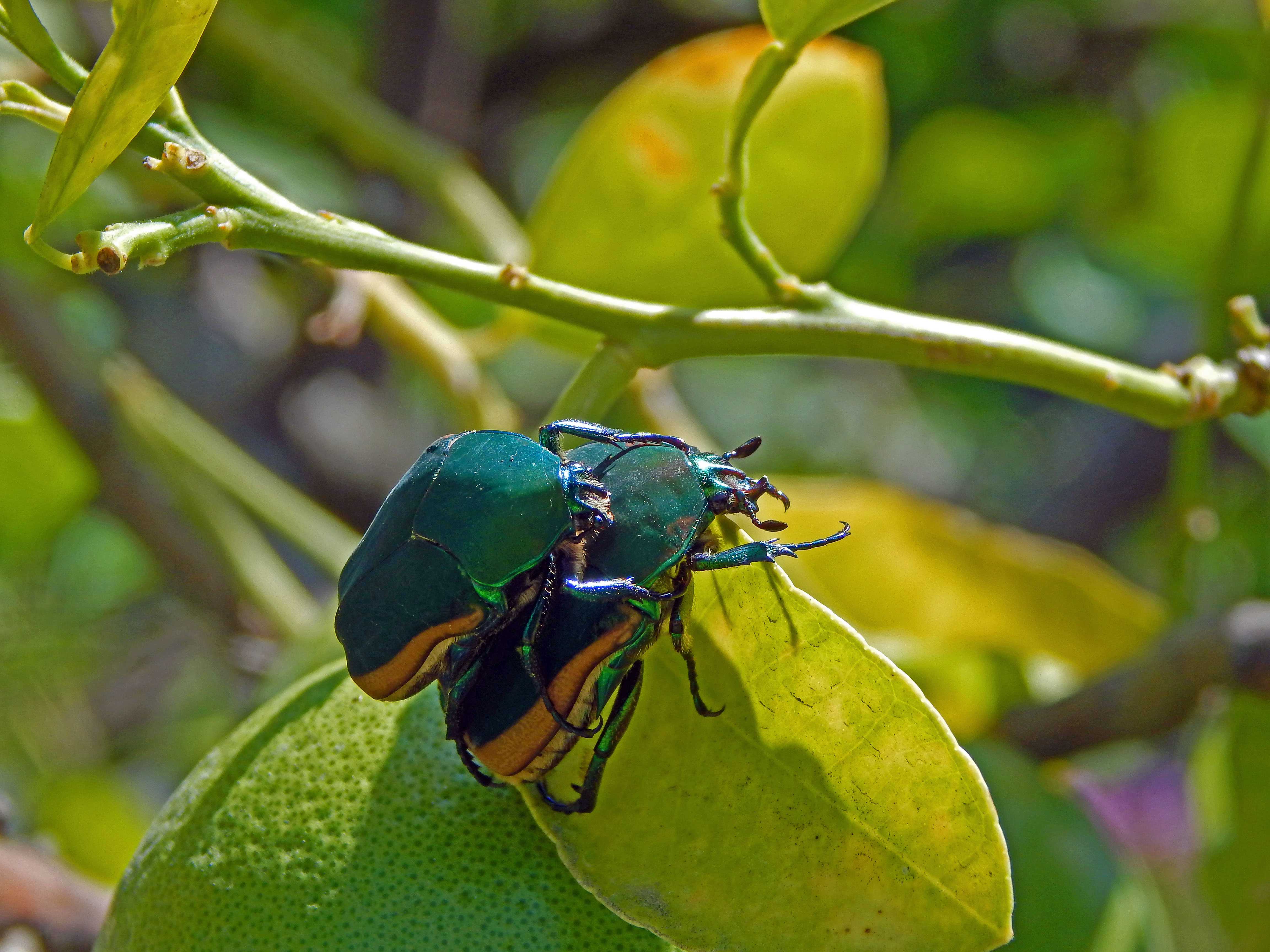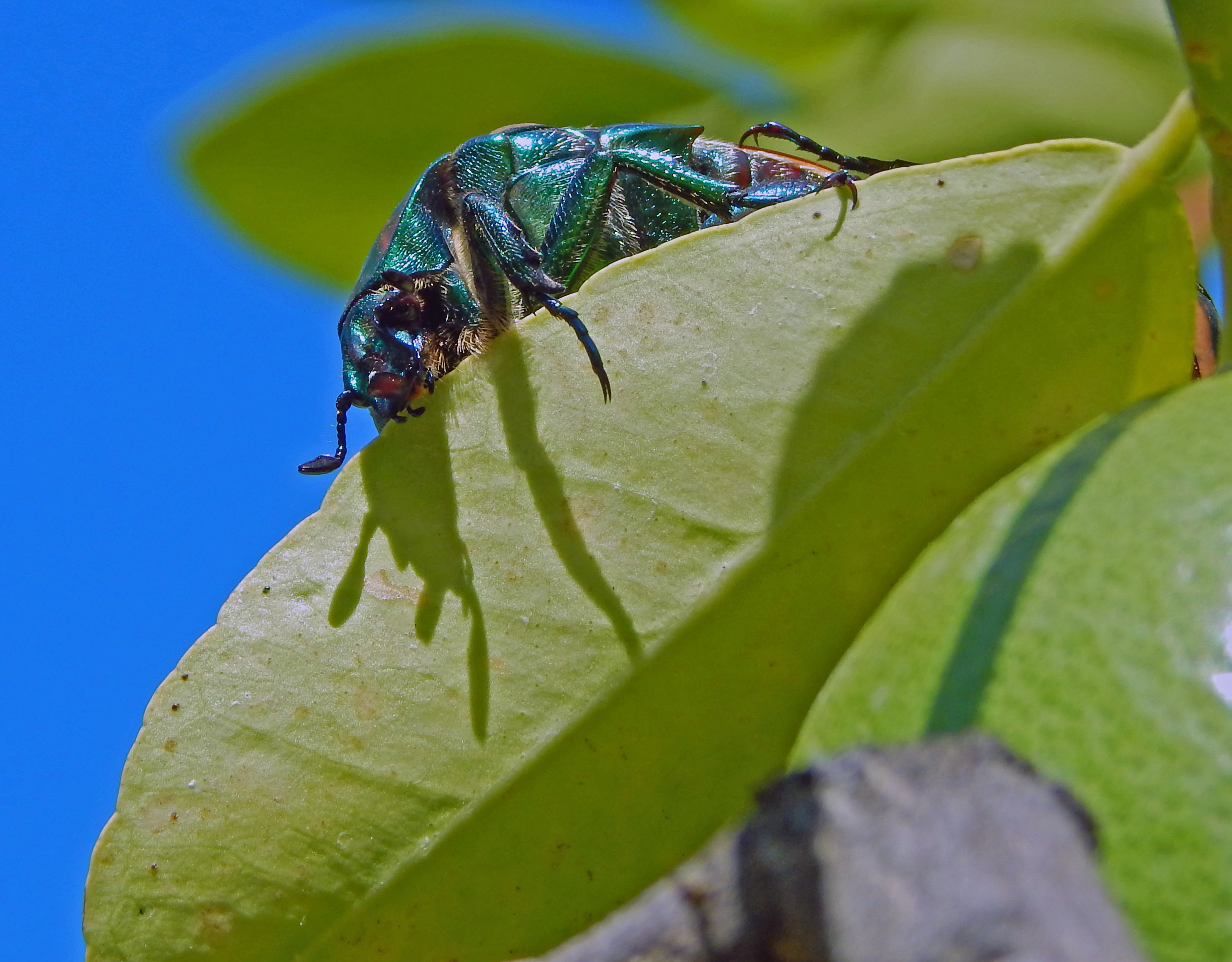 DSCN4482_edited-2June bug in a grapefruit tree. I remember these iridescent bugs from my Arizona childhood. Not surprising, since their habitat is the U.S. southwest. They’re really quite gorgeous. An example of a scarab, the official name of this particular specimen is Figeater beetle.