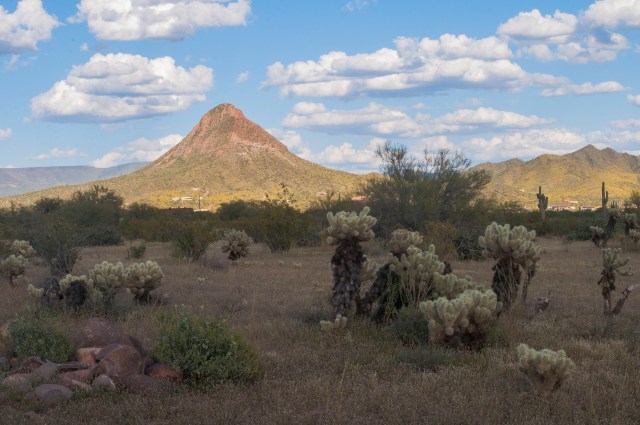 The white cacti in the first photo are cholla, or jumping cactus. Pretty but fierce! And that first photo is “just” an empty field. In fact, it’s all empty fields. The landscaping at my sister’s house is typical — gravel, palo verde trees, an ocotillo and a saguaro cactus. All low/no maintenance. Pretty typical for around there.